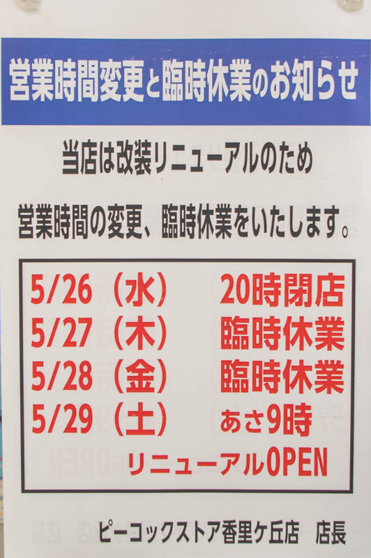 香里ケ丘のピーコックストアが改装リニューアルするようです。