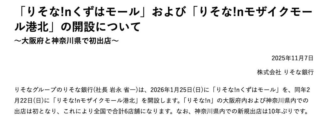 りそなホールディングスのニュースリリースによると、大阪府内ではくずはモールが初出店だということも書かれています。