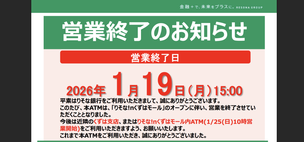くずはモール内の「りそな銀行ATM」が1月19日で営業を終了するようです。
