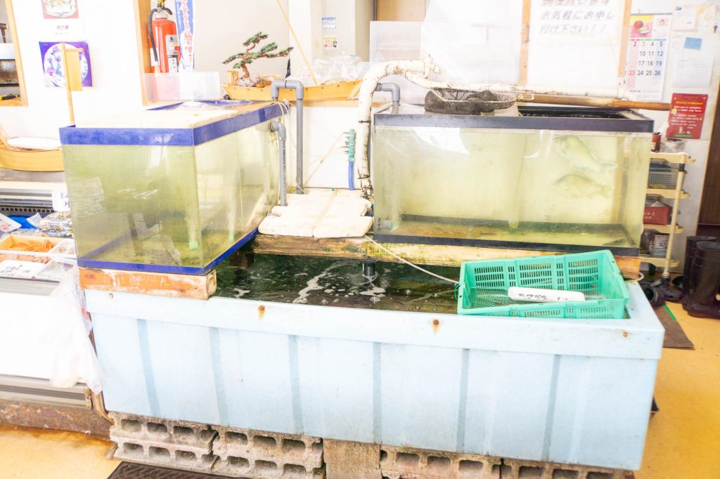 店内には生け簀があり、ヒラメ、フグ、タイが泳いでいました。