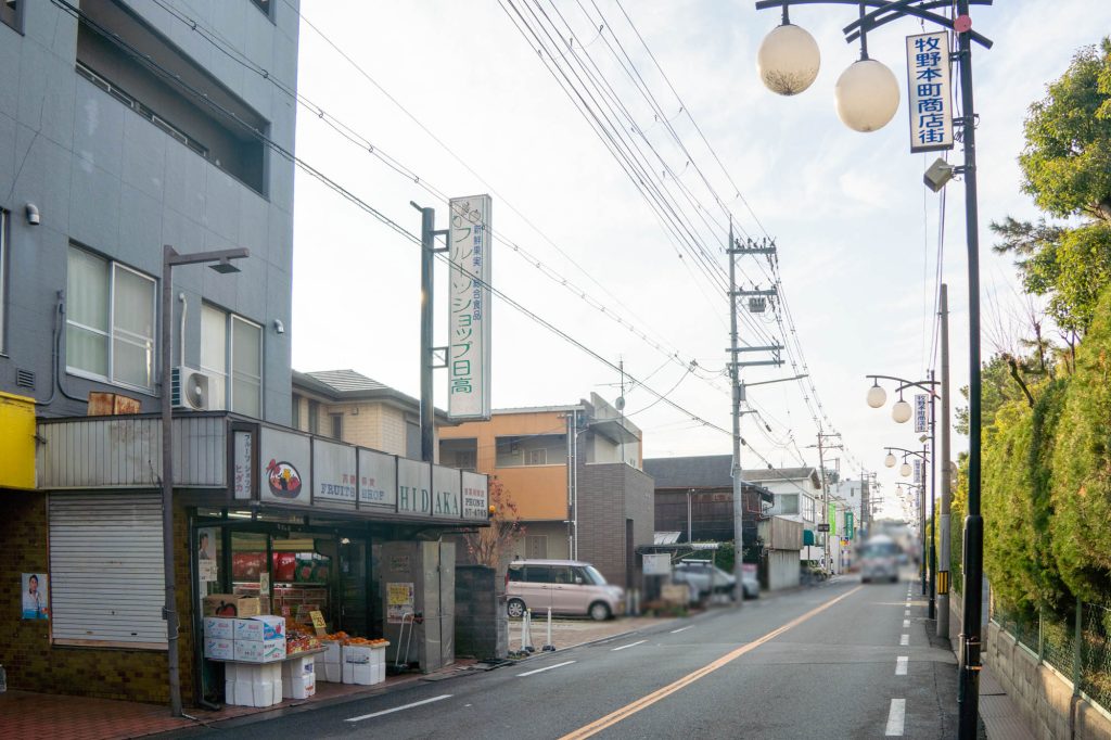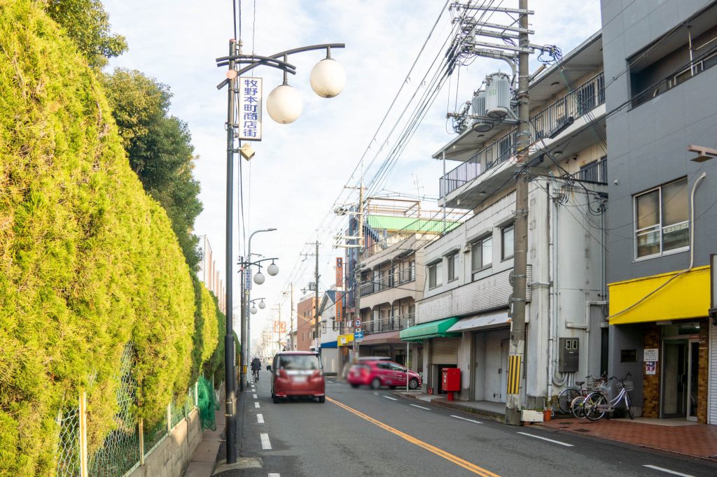 反対方向に行くと関西スーパー、コノミヤなどがあります。向かいには関西医科大学 牧野キャンパスが。