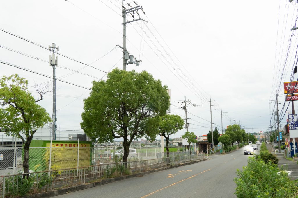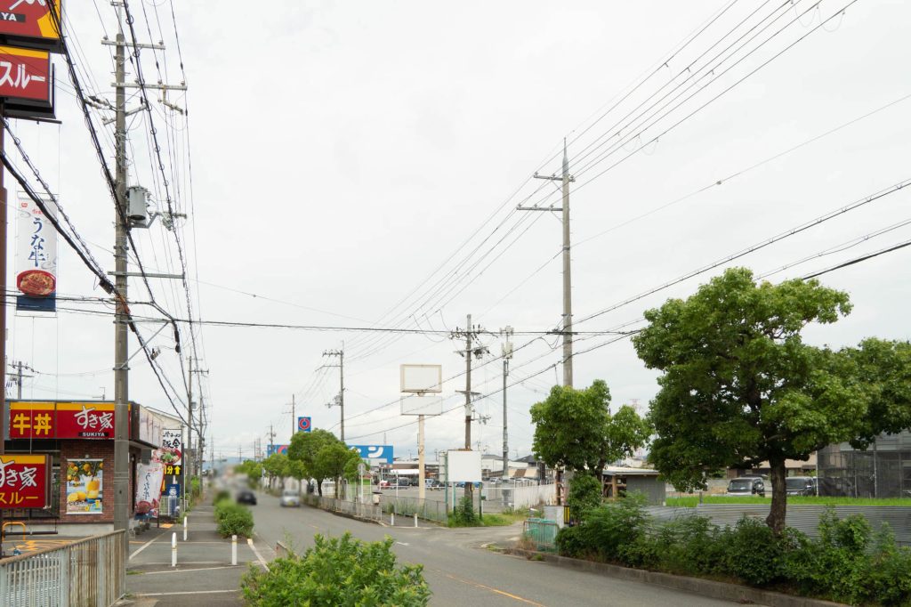 反対方向の道を挟んだ向かいにはすき家。進んでいくと香の川製麺が近くにある交差点「津田中学校前」へ。