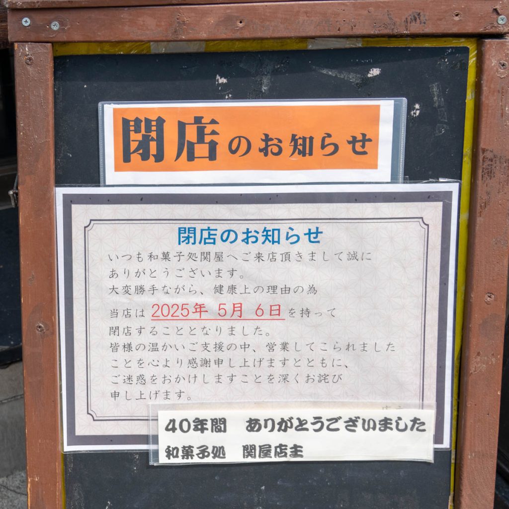 西禁野の「御菓子司 関屋」が5月6日で閉店するそうです。