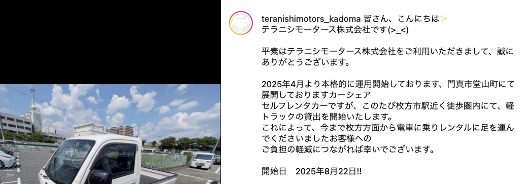 「テラニシモータース」のInstagramを見てみると、軽トラックの貸出を開始するということが書かれています。