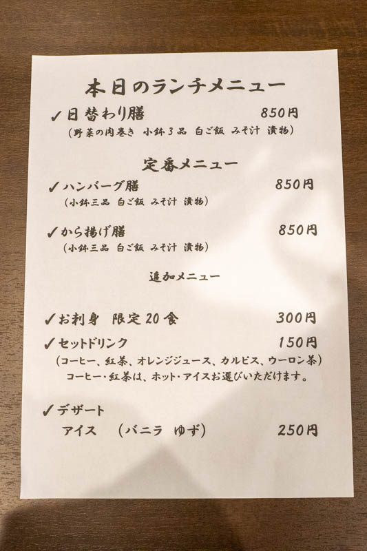 上記にメニューには載ってないのですが、ミックスフライ膳 850円、オムライス(限定10食) 650円もあるとのこと。