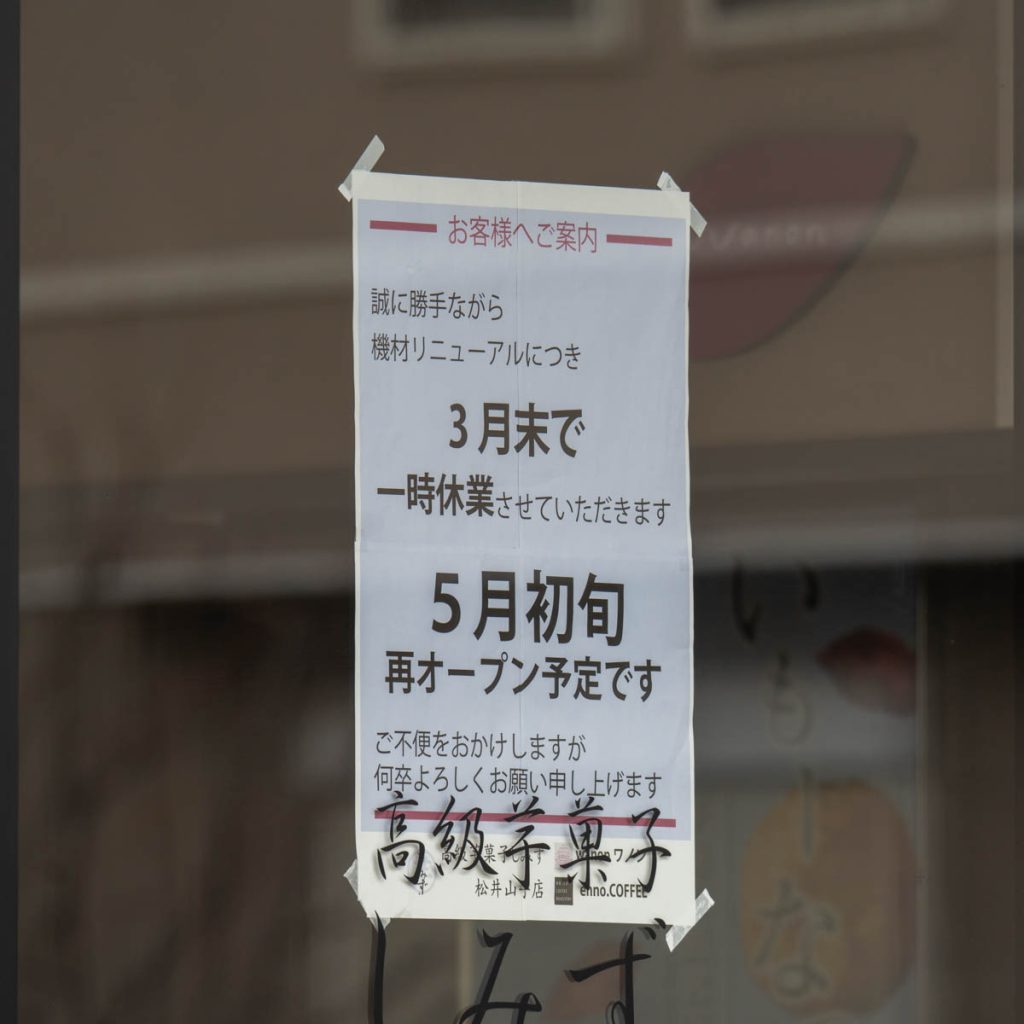 松井山手の「高級芋菓子しみず 京都松井山手店」が休業しています。
