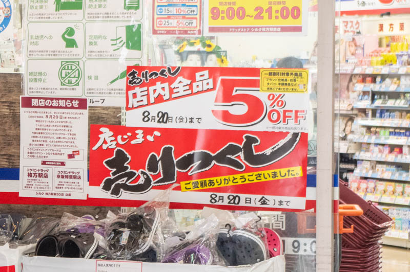 枚方市駅ちかくのドラッグストア「シルク」が8月20日で閉店 投稿日 2021年6月8日 15:30 著者 ガーサン カテゴリー 開店・閉店 枚方市駅ちかくのドラッグストア「シルク 枚方駅前SD店」が8月20日をもって閉店するようです。 ↓こちら 枚方テイク・ツー 地図ではここ↓ 枚方市駅からすぐ目の前。枚方テイクツウビル1Fにあります。 閉店のお知らせ↓ お店には上記のような貼紙が。8月20日に閉店するとのことでした。 ここが閉店すると最寄りのグループ店舗は枚方市駅のザ・ストア内と樟葉駅近くの店舗に。 現在、売りつくしで店内全品5%OFFとのこと。 駅前でしたし、よく利用していた方もいらっしゃるのでは。 ■関連リンク 枚方市内と近隣の開店・閉店一覧(日付順)2021【ひらつーまとめ】 – 枚方つーしん今年も、「いつか見たあのお店の開店(閉店)の記事、どこにあるんかな?」「あのお店のオープン情報、すでに記事になってたっけ…?」 といった際に確認しやすいように、…www.hira2.jp ドラッグストア アーカイブ – 枚方つーしんwww.hira2.jp シェア ツイート LINE シルク テイクツービル ドラッグストア 岡本町 枚方市駅 枚方市駅・枚方公園駅エリア 閉店