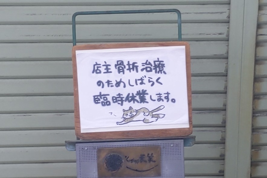 店頭にあった貼紙。店主さんが骨折治療のためしばらく臨時休業すると書かれています。