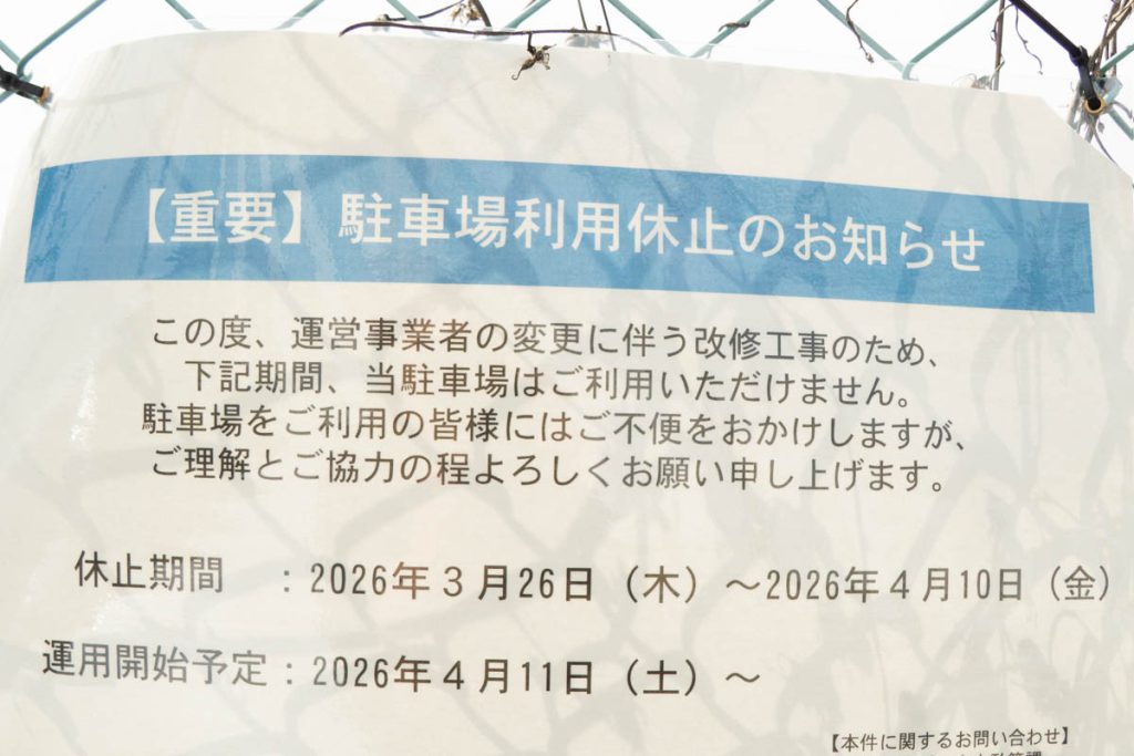 現地にあった貼紙によると、運営事業者が変更されるようで4月10日まで利用ができなくなっていました。