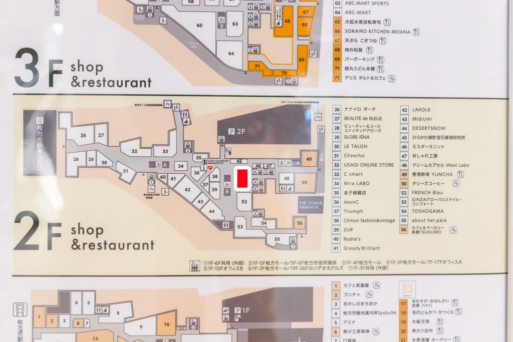 館内のマップでいうと、赤色に加工した場所です。2階にありまして、東改札口側の出入り口からずっとまっすぐ行くとたどり着けます。