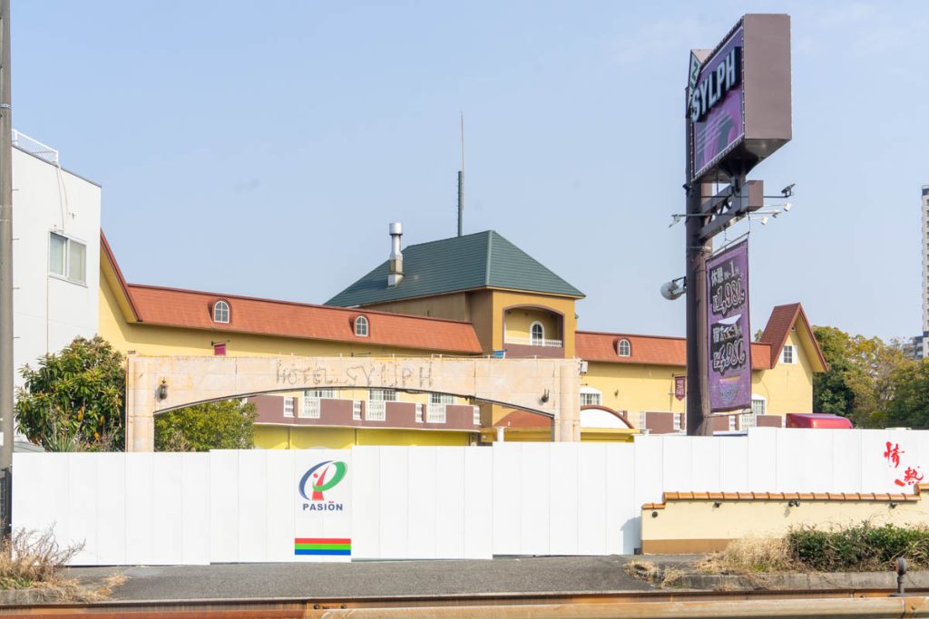 国道1号線沿い菊丘町の「シルフエトワール」がパネルに囲まれて入れなくなっています。