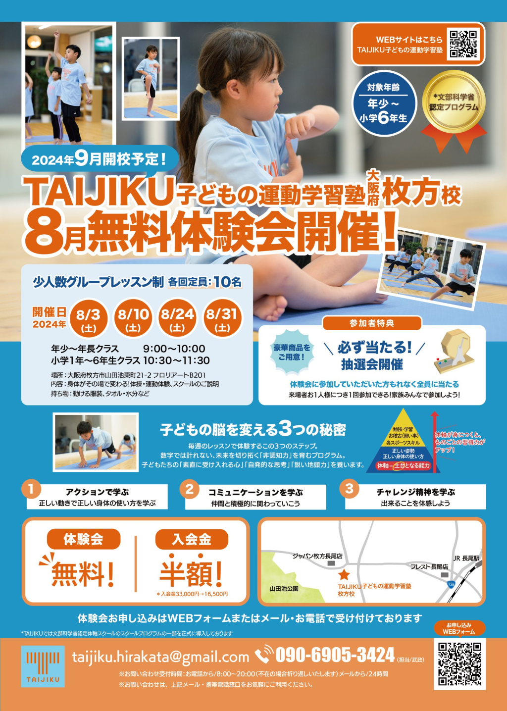 いただいた情報によると、「TAIJIKU」とは予防医学をもとにした体軸体操という体操プログラムを中心とした体操教室で関西ではこちらの教室の他に三重県や滋賀県に教室があるようです。枚方校は9月開校予定とのこと。
