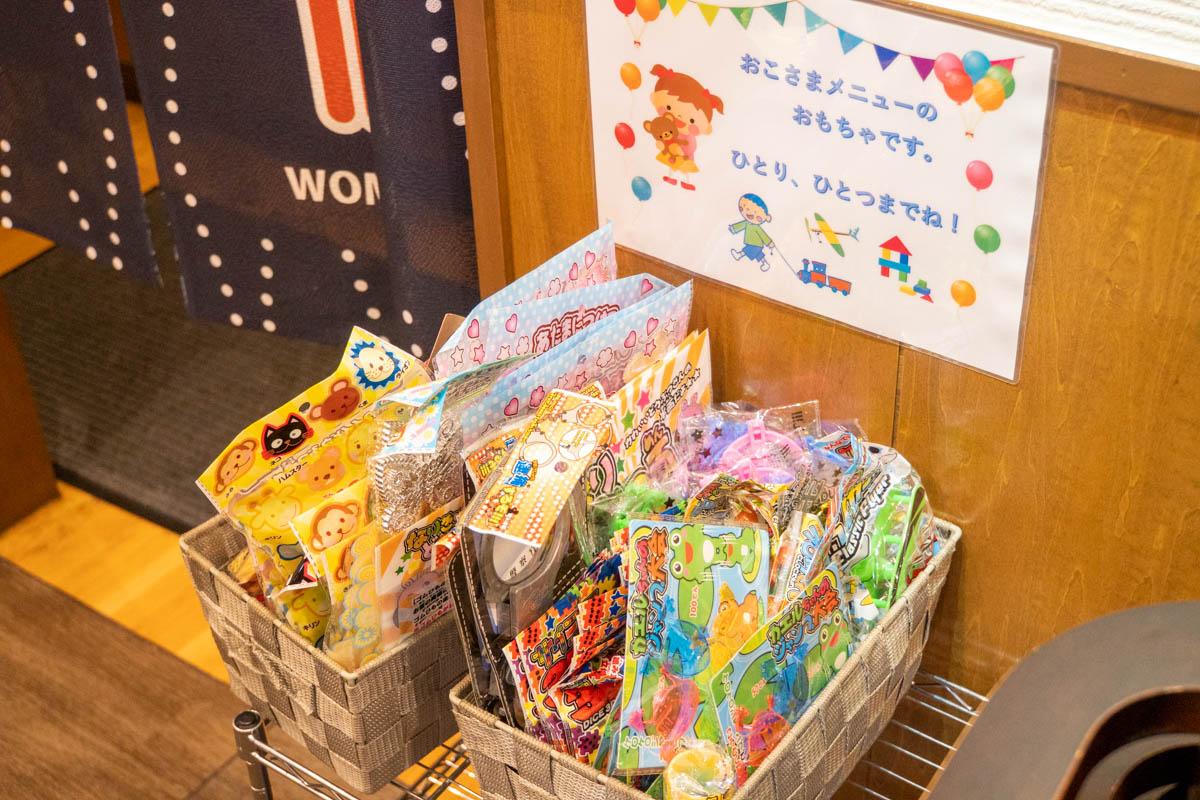 お子さん用の椅子と、おこさまメニューにはおもちゃも!