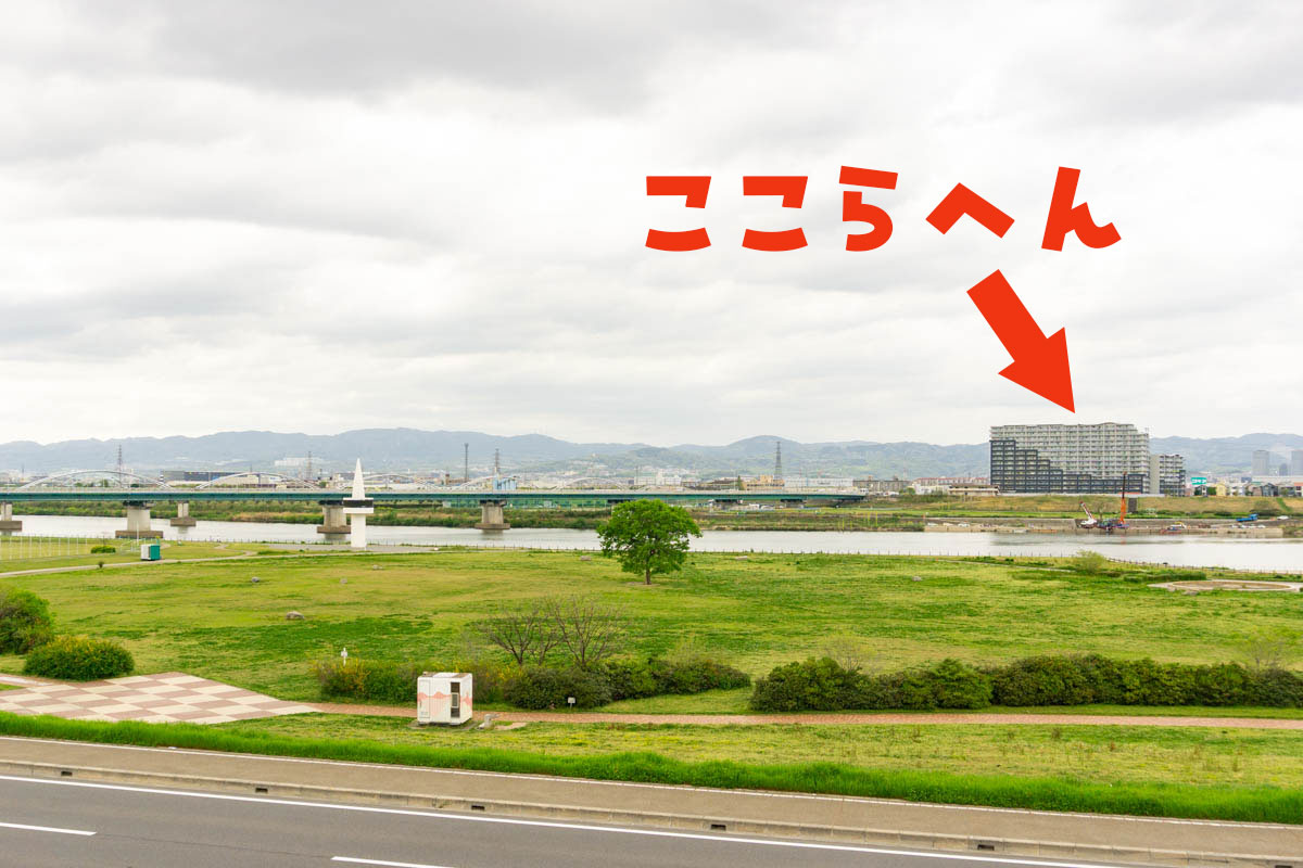 こっちにいくと枚方大橋を渡って枚方市へ。