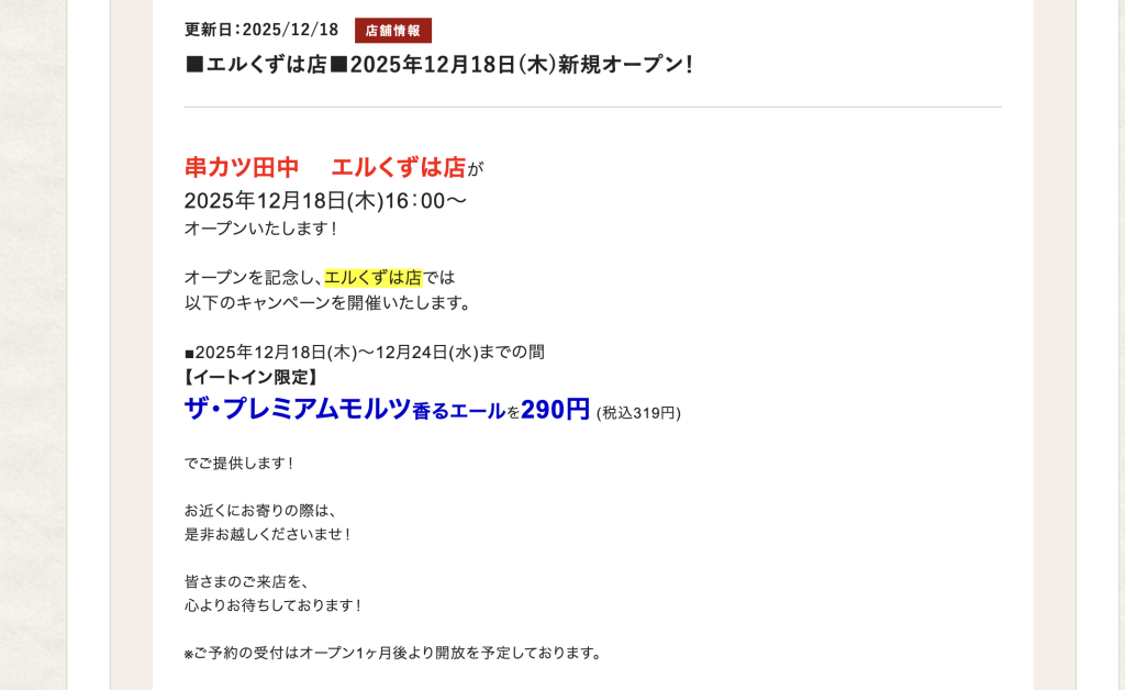 串カツ田中の公式サイトによると、12月18日にオープンしたとのこと。