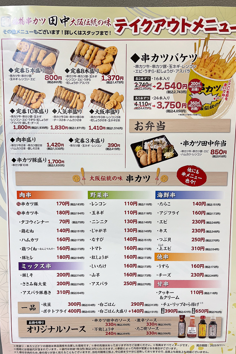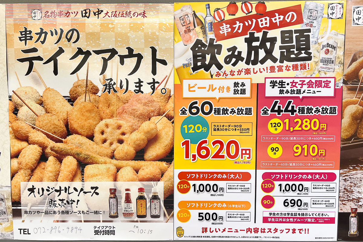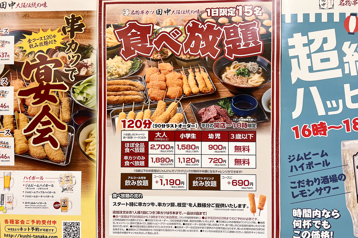 店頭にあった貼紙には、串カツの食べ放題に関する案内も。テイクアウトもかなり充実していますし、テイクアウトしておうちで串カツを楽しんだりもいいですね〜!