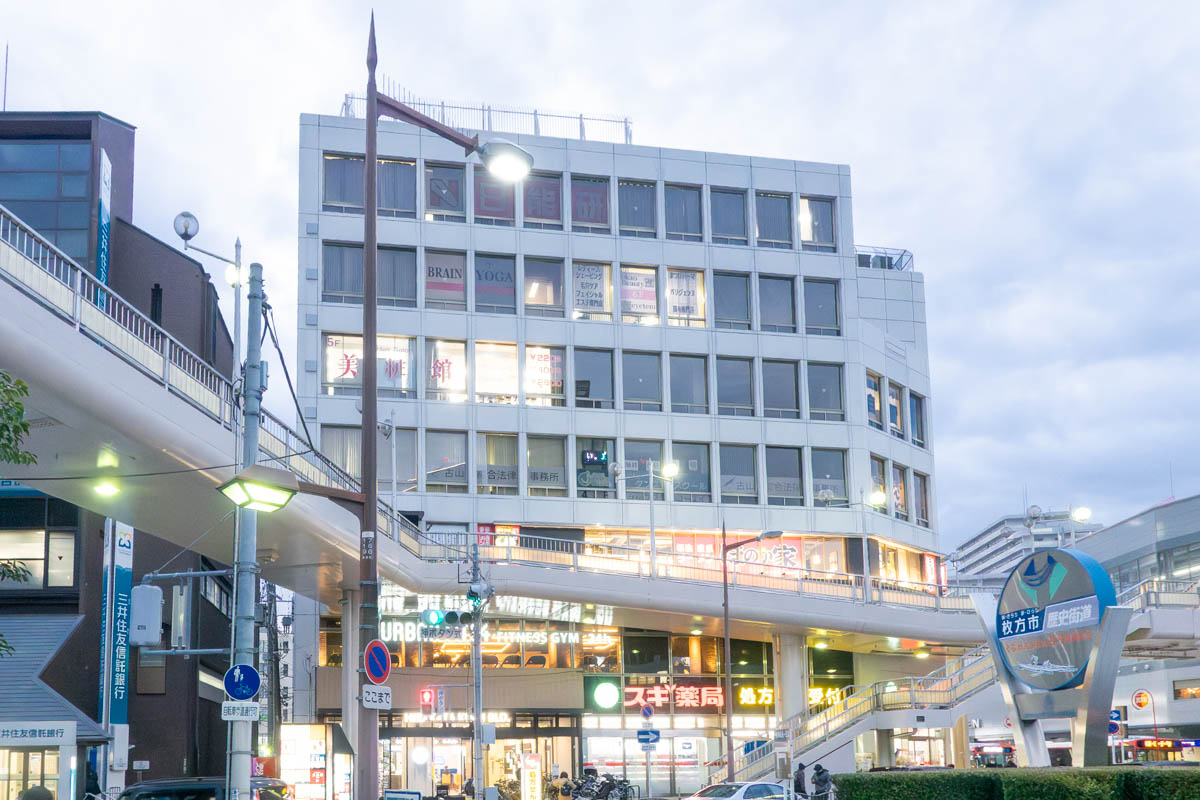 右に少し映っているのが「Hirakata Woven」。同じビル内にはやよい軒なども入っています。