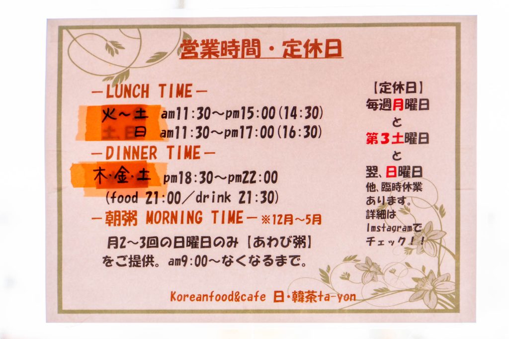府道18号線沿い東香里南町の韓国料理店「Koreanfood&cafe日·韓茶ta-yon」が夜営業をはじめています。