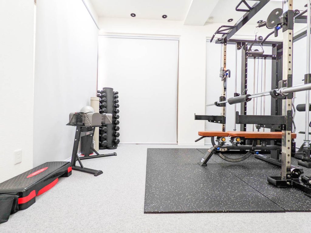 ジム内にはダンベルセットなど様々な器具があります。