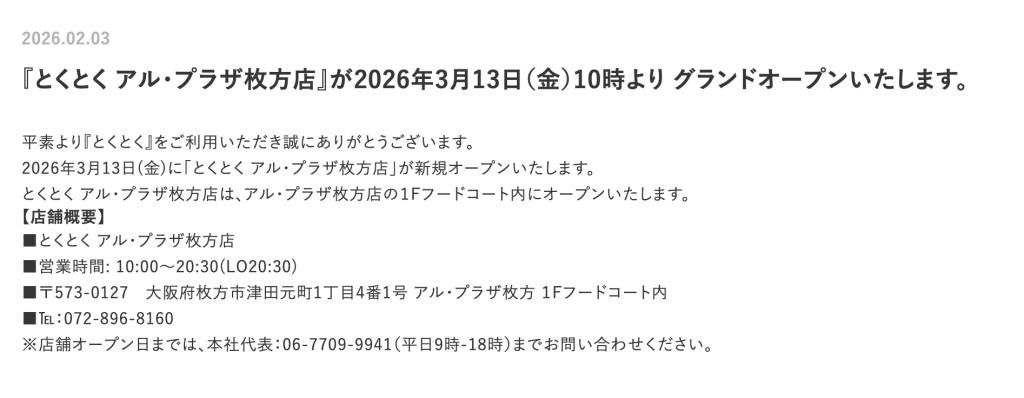 お店の公式サイトを見てみると、アルプラザ枚方の1階フードコートにオープンするということが書かれています。