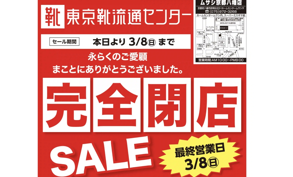 松井山手のムサシにある「東京靴流通センター ムサシ京都八幡店」が3月8日で閉店するようです。