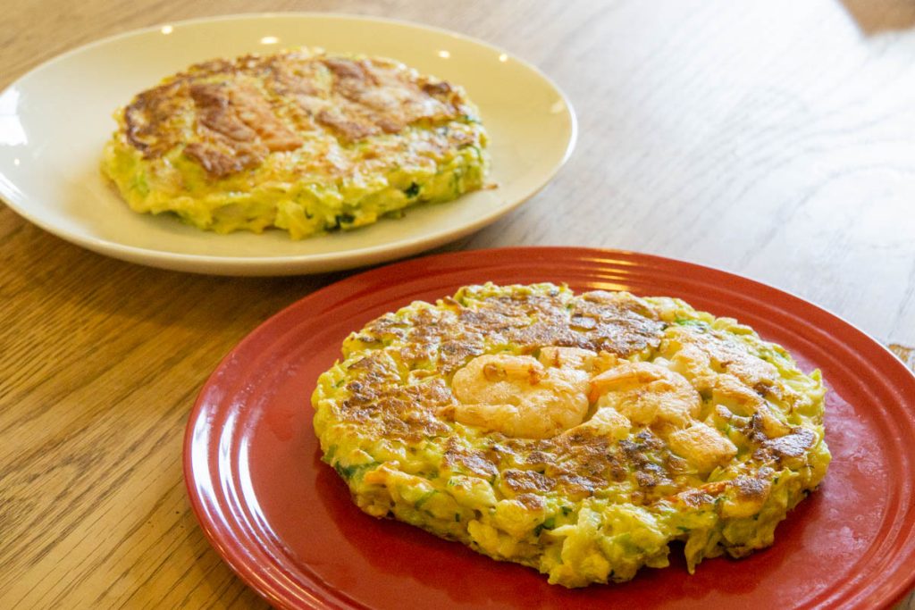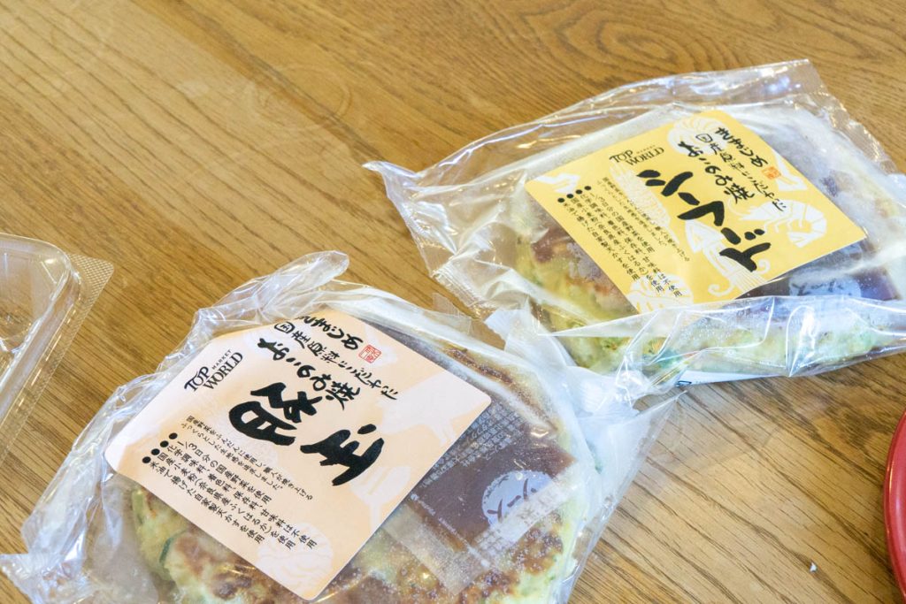 中には豚玉、シーフードのお好み焼きが。