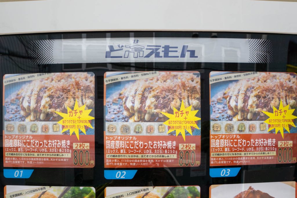 香里園の「トップワールド香里園店」にラーメンや焼きさば寿司など食品を売る自動販売機が2台設置されています。