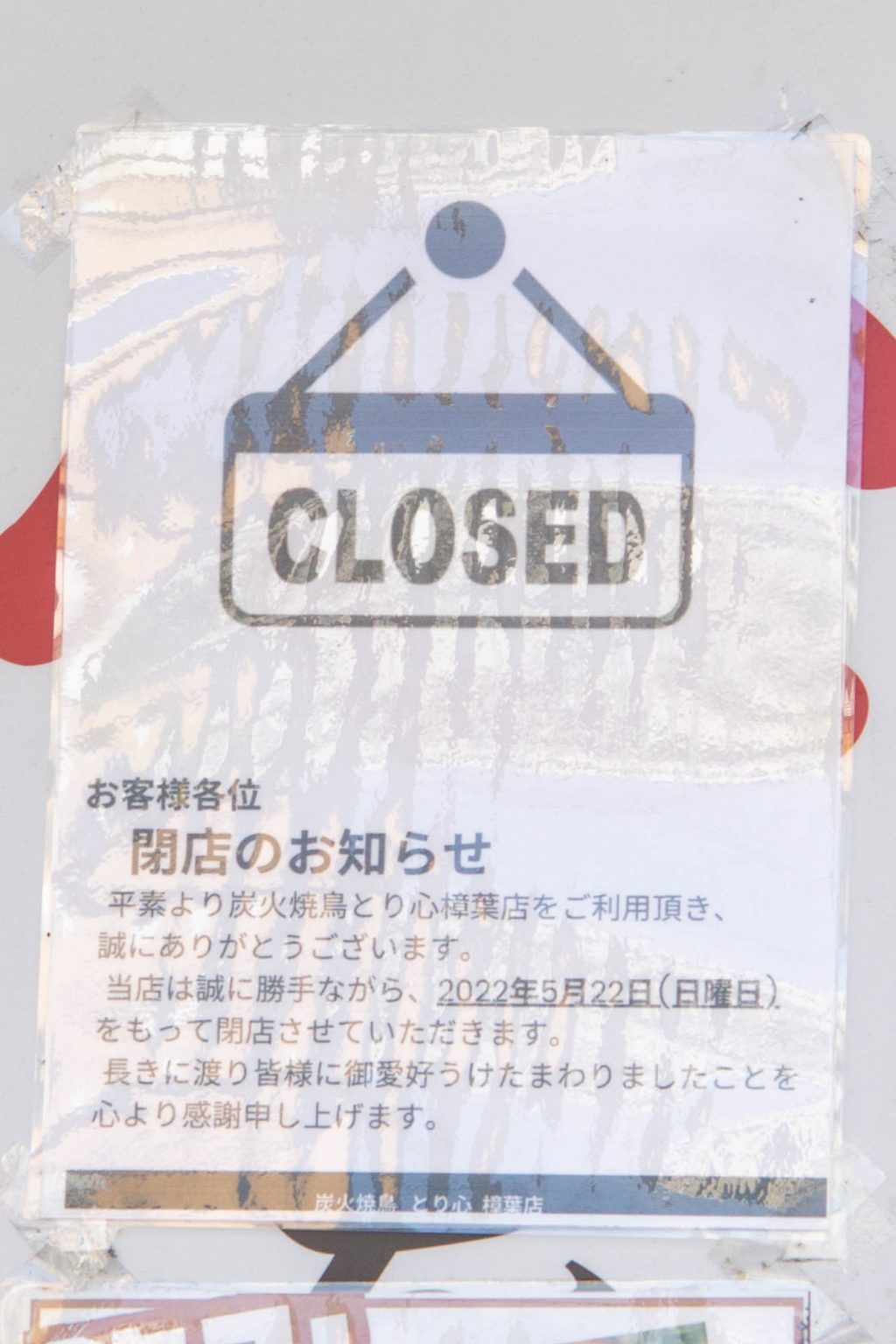 町楠葉の「炭火やきとり とり心 樟葉店」が閉店しています。