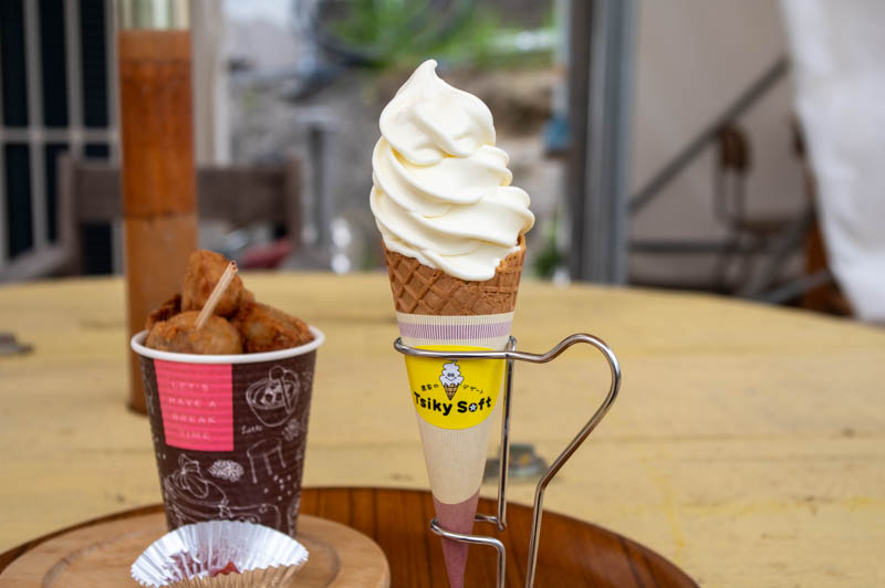 実際に食べたソフトクリーム&小芋のからあげ↓