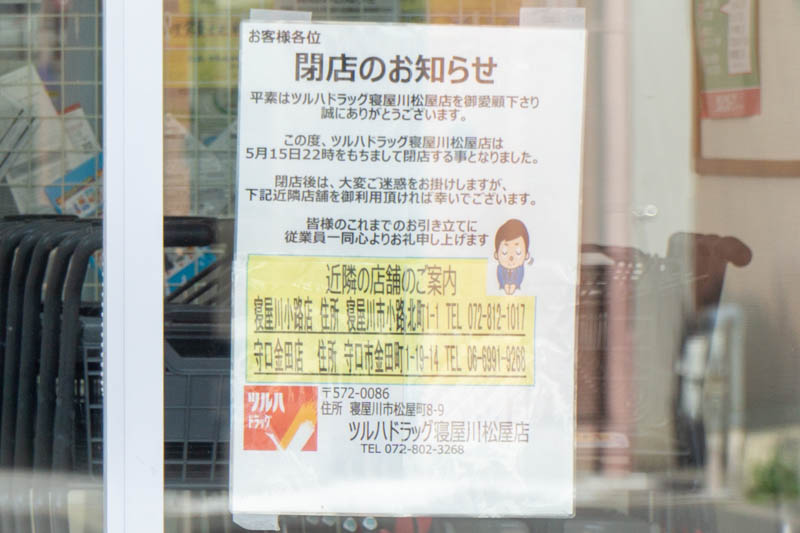 香里園の「ツルハドラッグ寝屋川松屋店」が5月15日で閉店するようです。