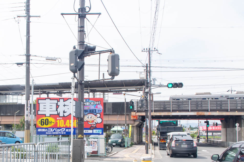 反対方向へ行くと藤阪駅があり、線路をくぐって直進すると府道736号線との交差点「藤阪駅前」にでます。