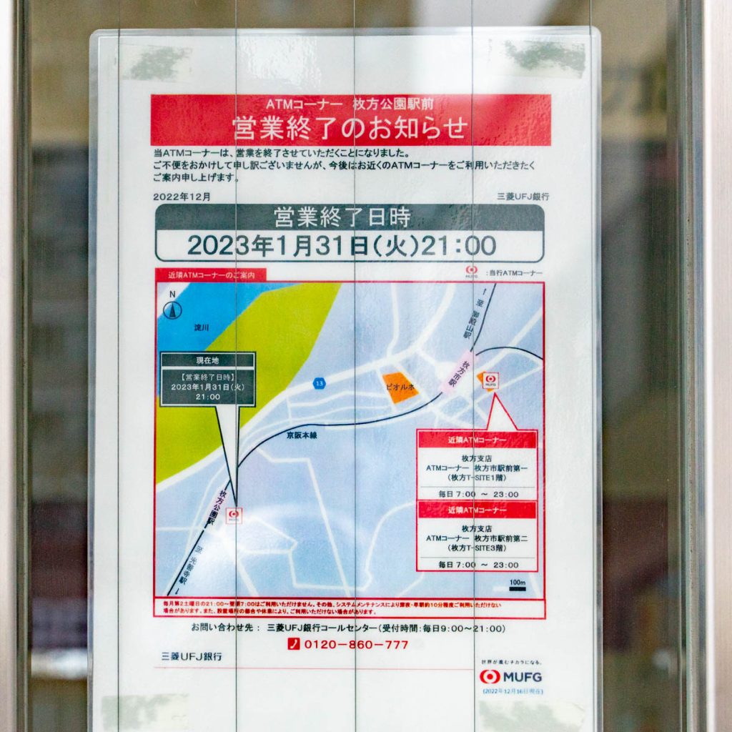 枚方公園駅ちかくの三菱UFJ銀行の「ATMコーナー 枚方公園駅前」が1月31日で営業終了するようです。