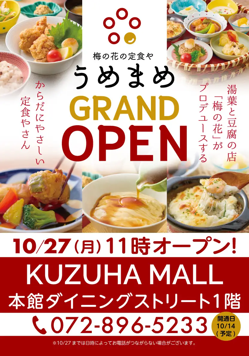 ソースは求人サイト。内容をみてみると「定食やうめまめ」が、くずはモールにオープンすることが書かれています。オープン時期は10月後半とのこと。