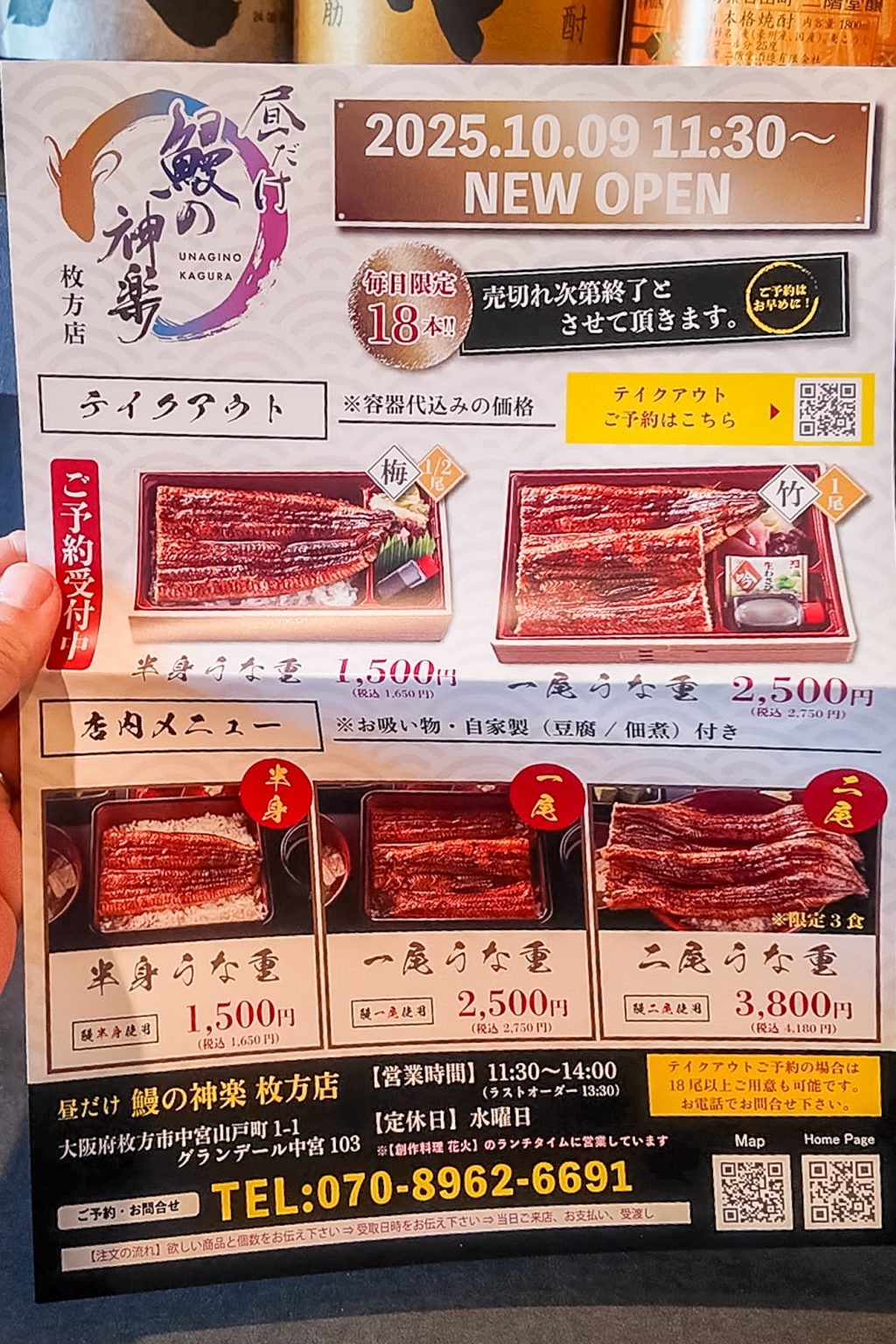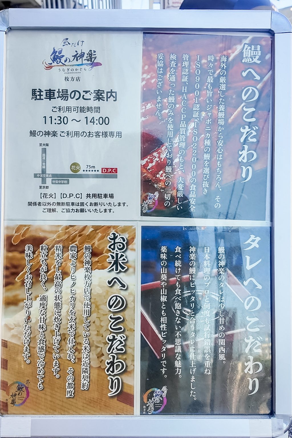 「鰻の神楽」は、枚方店以外にも、加古川、明石、宮崎、高砂、加東、豊田、大阪城など、複数のエリアで店舗を展開しているチェーンです。大阪ではここが2店舗目。