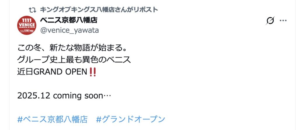 八幡一ノ坪の「キングオブキングス 八幡店」が『ベニス 京都八幡店』になるようです。