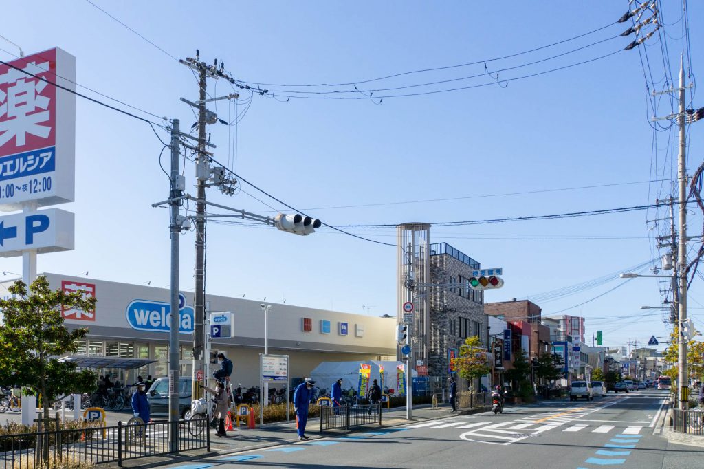 反対方向には交番やアマーク・ド・パラディICC、関西外大などがあります。進んでいくと都丘町や須山町方面。