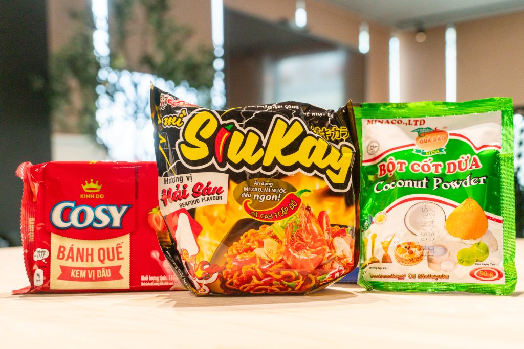 実際にいくつか買ってみました。真ん中のインスタント麺はエースコック!右上にカタカナで「ゲキカラ」と書かれています。これがタピオカ粉が入ってもっちもちの甘辛ラーメンで家族に好評でした!