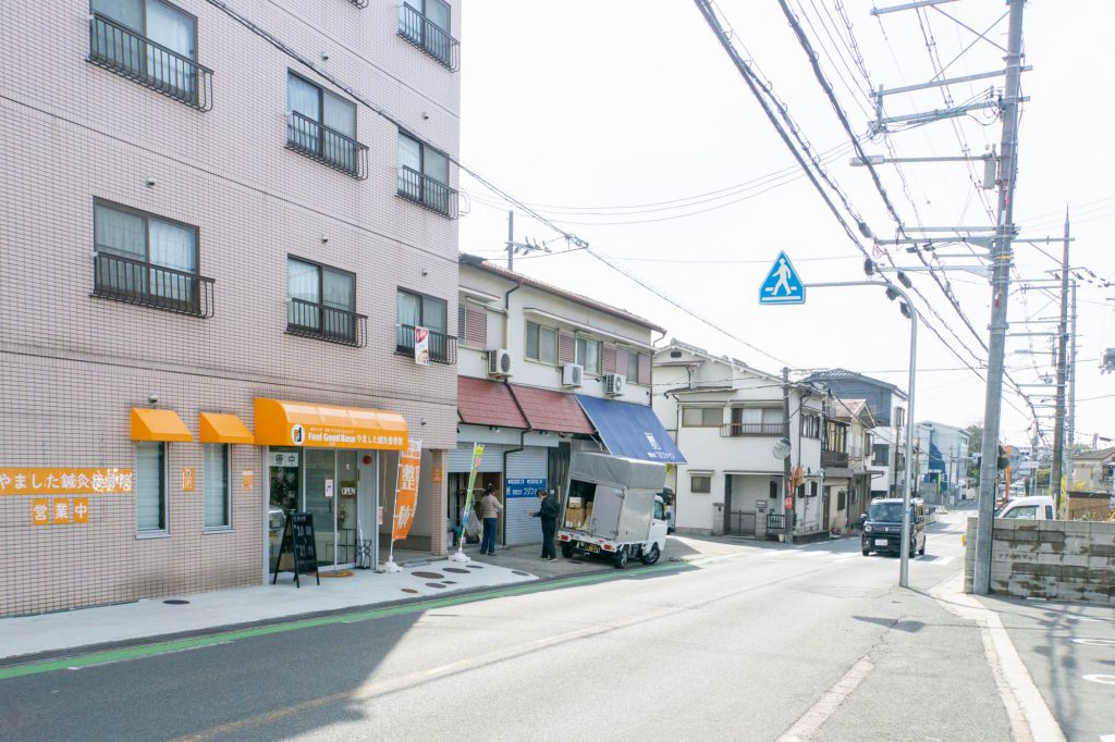 反対方向は長尾駅方面。進んでいくと業務スーパーなどが。