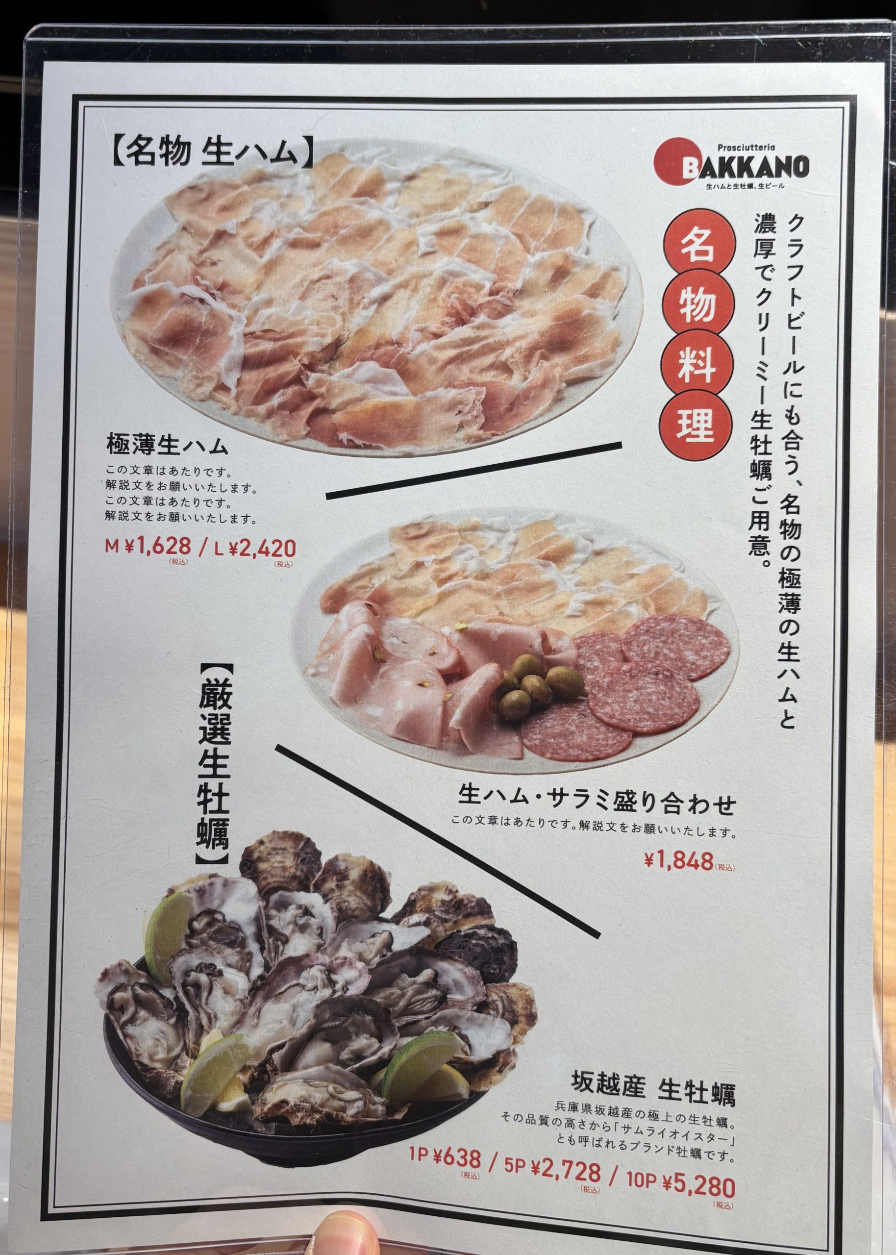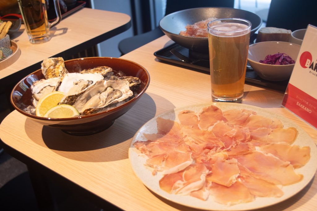 「生ハムと生牡蠣、生ビール BAKKANO」