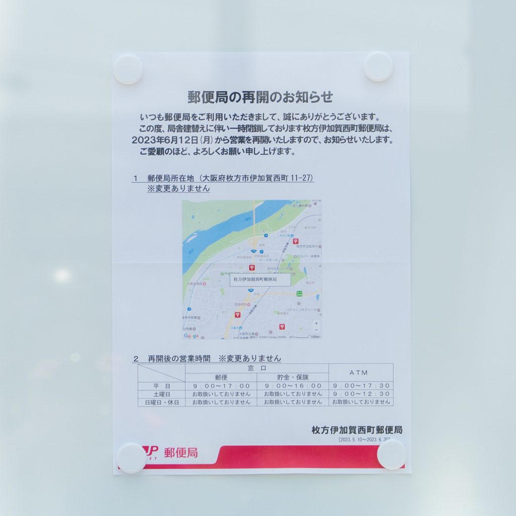 伊加賀西町で建て替えていた「枚方伊加賀西町郵便局」のリニューアルオープンは6月12日のようです。