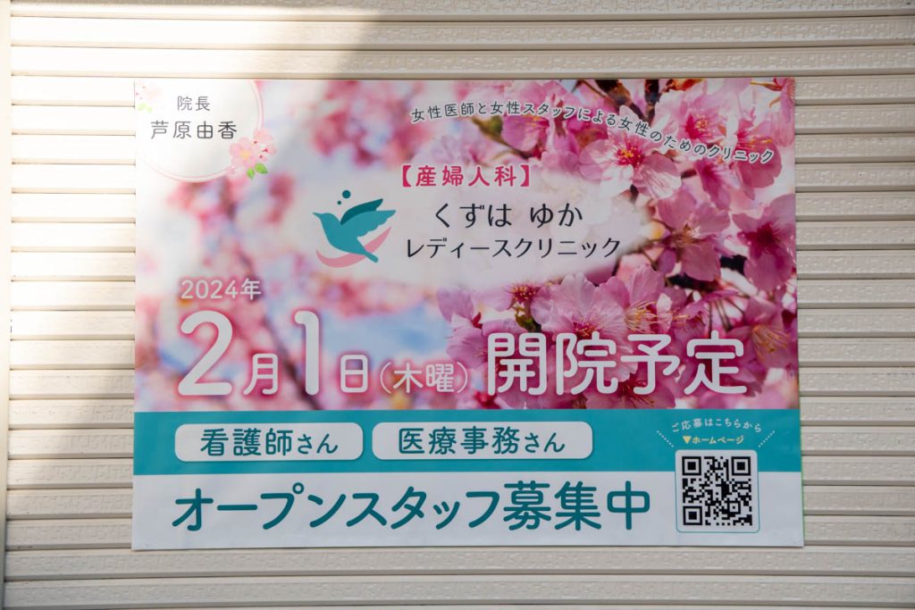 現地にあった貼紙等によるとこの場所には「くずは ゆかレディースクリニック」ができることが分かります。
