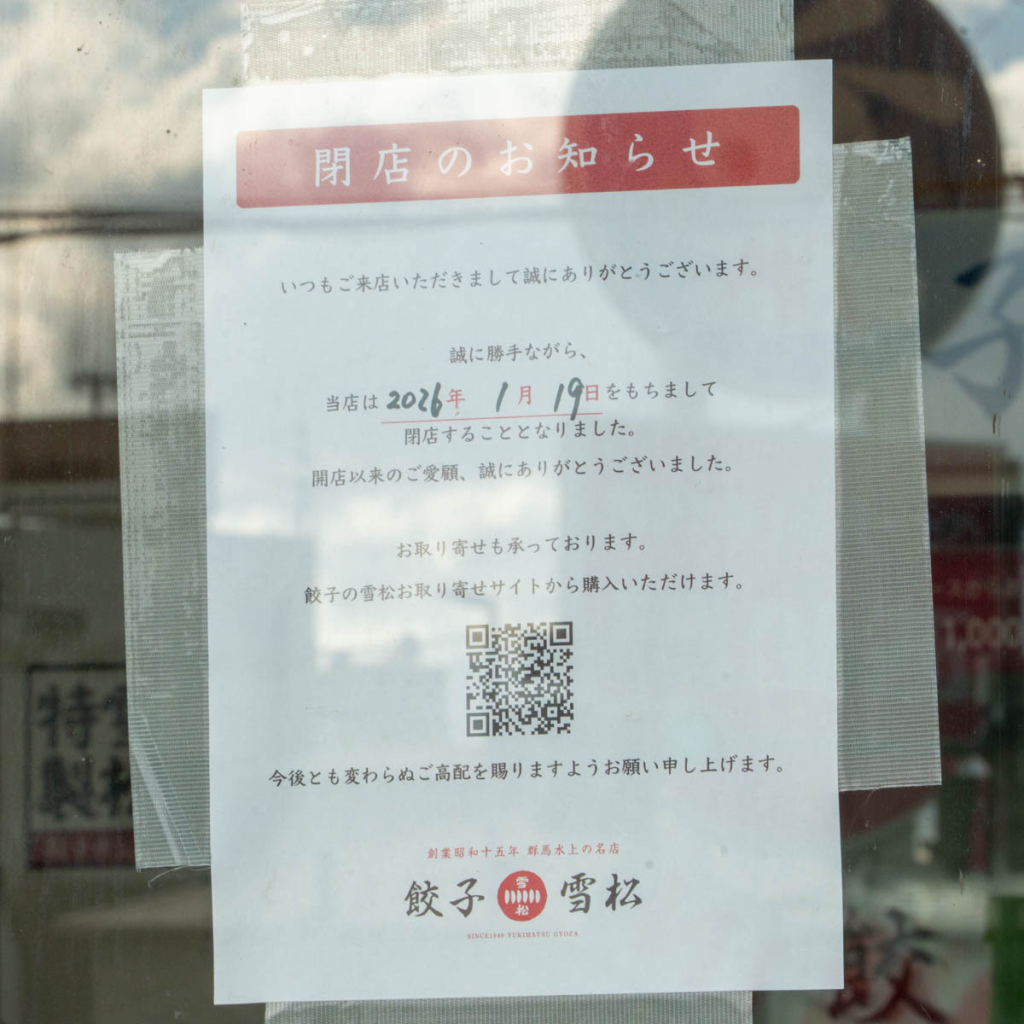 現地にあった貼紙によると、1月19日をもって閉店するとのこと。なお、餃子の雪松のお取り寄せサイトから購入可能ということも書かれていました。