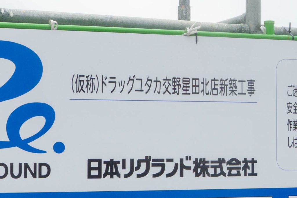 工事現場前には「(仮称)ドラッグユタカ交野星田北店新築工事」と書かれた看板が。