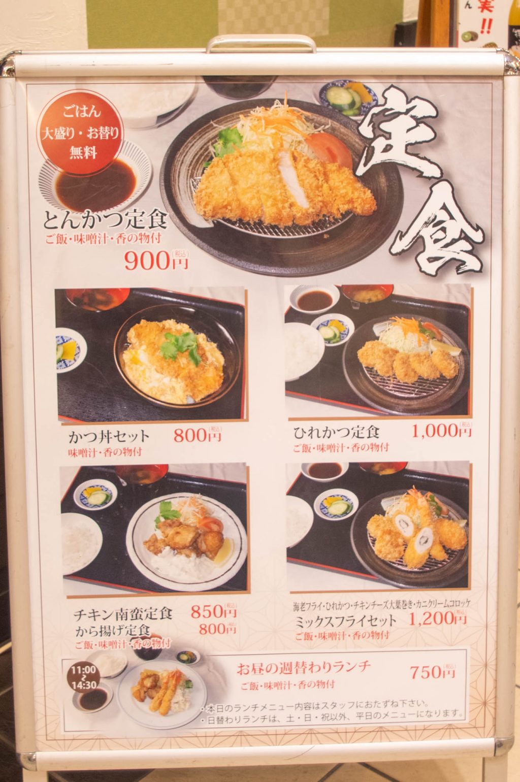 とんかつ定食900円、かつ丼セット800円、お昼の週替わりランチ750円。