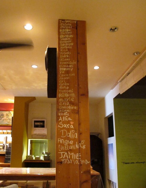 店内の柱には今までに働いていたアルバイトさんの名前が書き込まれています。ヒトツナギ5人目の山下さんの名前も。