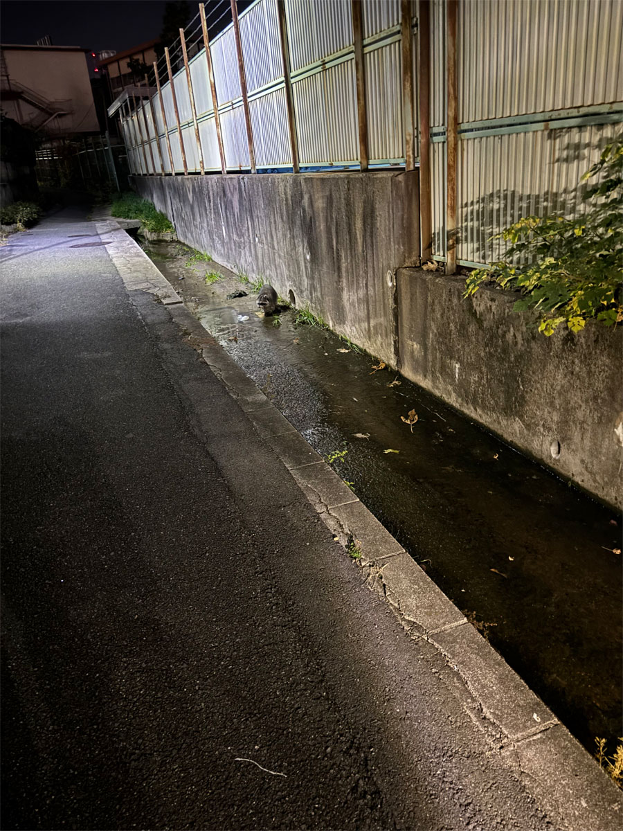 19時ごろ津田小学校の裏の道を通ると、パシャパシャ音がすると思って見ると排水路に2匹のアライグマがいました。