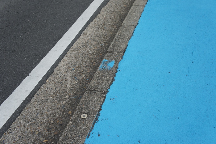 先日、枚方市駅から市民病院のほうへ上がる坂道の歩道がアクアな色に塗られているとお伝えしましたが、途中から普通の青になってました。わかります?