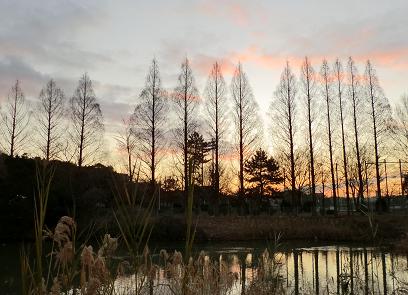 樹が整然と並んでいて綺麗な夕暮れですね~。