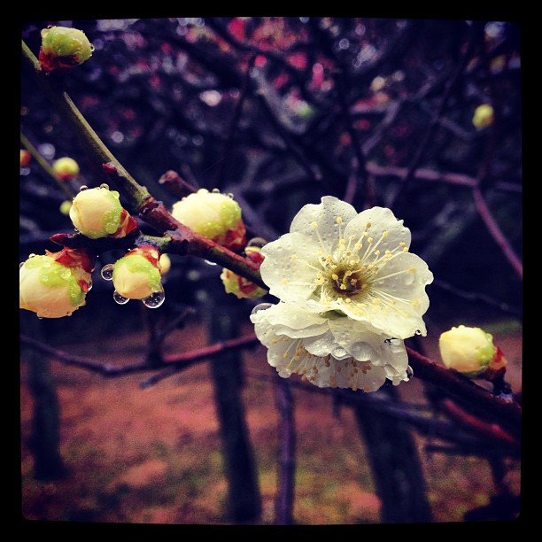 | ▼雨の中、意賀美神社の万年寺山梅園を覗きに行きました。平日だし、雨だし、貸し切り状態。 ただ、傘を持っているので、枝をかき分けて中に入るのが難しく…。とにかく梅を傷つけないように注意して撮りました。雨の日は雫と一緒に撮れるのでまた趣きがありますね。 |