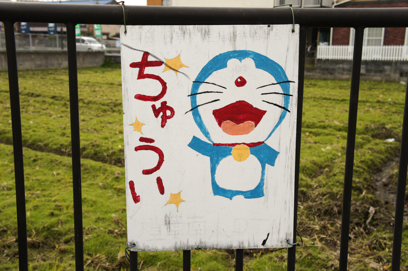 ここであの「ドラえもん」が道行く車に「飛び出し注意」を訴えてます。